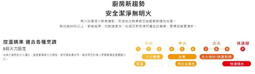 產品特色 ✔火力1-9段數模式運用: 小火:1-2 保溫 | 2-3 小火燉煮 中火:4-6 水煮 | 5-6 煎出金黃色 大火:7-9 大火快炒 / 快速煎烤 P 段:9-P 快速燒水