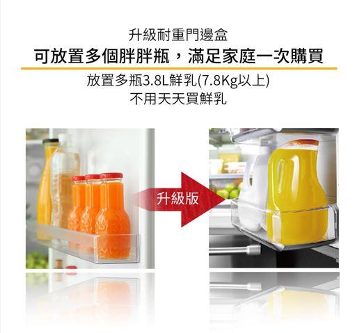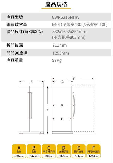 一般色彩 典雅白 年耗電量(度) 528 能源因數值(EF) 18.2尺寸規格總容量 640L (冷凍室210L / 冷藏室430L) 全寬 / 高 / 深(mm) 832 / 1692 / 854 (不含手把深(mm) 803) 拆門後深(mm) 711、開門90度深(mm) 1253 重量(kg) 97Kg 產地 墨西哥 冷媒 R134a 壓縮機 定頻主要機能冷藏室LED照明 v 冷凍室LED照明 v 耐重門邊盒 v 層板 無框強化玻璃層板 蔬果盒 蔬果鎖水保鮮室 冷凍室網架數 4 冷藏室層板數 4其他多段溫度控制開關 v Embraco壓縮機 v下標前請先詢問貨源