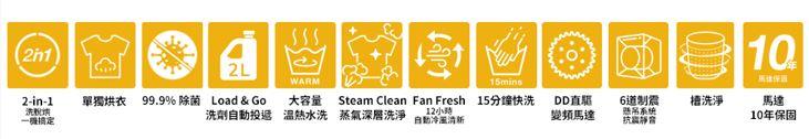型號:8TWFC6820LW 建議售價:$61,400 基本規格 容量 17kg(洗衣)/10kg(烘衣) 電源 120V/60Hz 消耗電功率 洗衣1000W / 乾衣1200W 經濟部省水標章認證 金級省水標章 尺寸 (寬x高x深) 686 x 982 x 802mm 重量 103kg 產地 美國機器設計 DD直驅變頻馬達 O 內建水溫加熱器 O 內槽材質 3D立體水波紋不鏽鋼 懸吊系統 制震六點懸吊 Load & Go洗劑精算科技 O (2L) 柔軟劑注入設計 O 漂白水注入設計 O 冷熱進水管設計 O 筒內照明燈 O 幫浦排水設計 O 適用洗劑 HE高效能低泡沫洗衣精 開門方向 左開洗衣/烘衣設計 蒸氣深層洗淨 O 12小時自動冷風清新 O 洗衣水溫選擇 5段水溫選擇 脫水轉速選擇 5段轉速選擇 衣物髒度選擇 4段髒度選擇 全自動智慧偵測水位 O 加強洗清選擇 O 中途加衣 O操作面板功能 操作介面 中文 全功能觸控設計 O LED數位顯示 O 預估剩餘時間顯示 O 行程狀態指示燈 O 兒童安全面版鎖 O 洗劑儲存量顯示 O 洗衣完成響鈴提醒 O下標前請先詢問貨源
